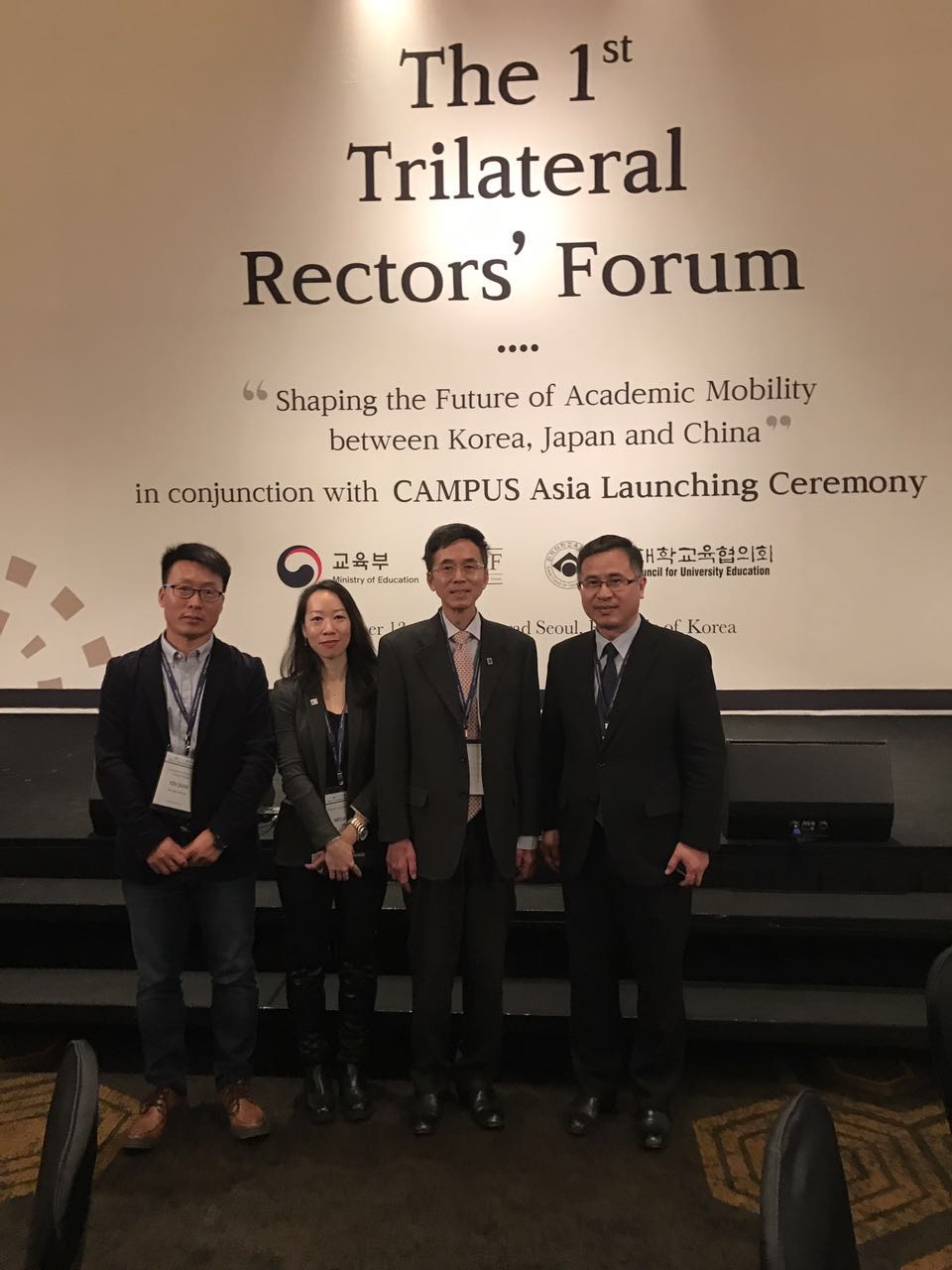 本网讯 2016年12月13日,由韩国教育部与韩国大学教育协会共同主办的中日韩亚洲校园常态化项目启动仪式暨第一届中日韩大学校长论坛在韩国首尔胜利召开。此次论坛旨在加强中日韩大学间的交流与合作,提高亚洲高校的整体国际竞争力,探讨中日韩移动办学的未来。“广东外语外贸大学”、“北京大学”“复旦大学”等17个亚洲校园共同体成员出席此次论坛,中、日、韩共40所大学的代表共济一堂,分享高等教育的专业知识和经验。陈多友东语学院院长,全优亚洲校园教育中心副主任作为校长特使与会。本次论坛上,亚洲校园常态化项目正式启动。