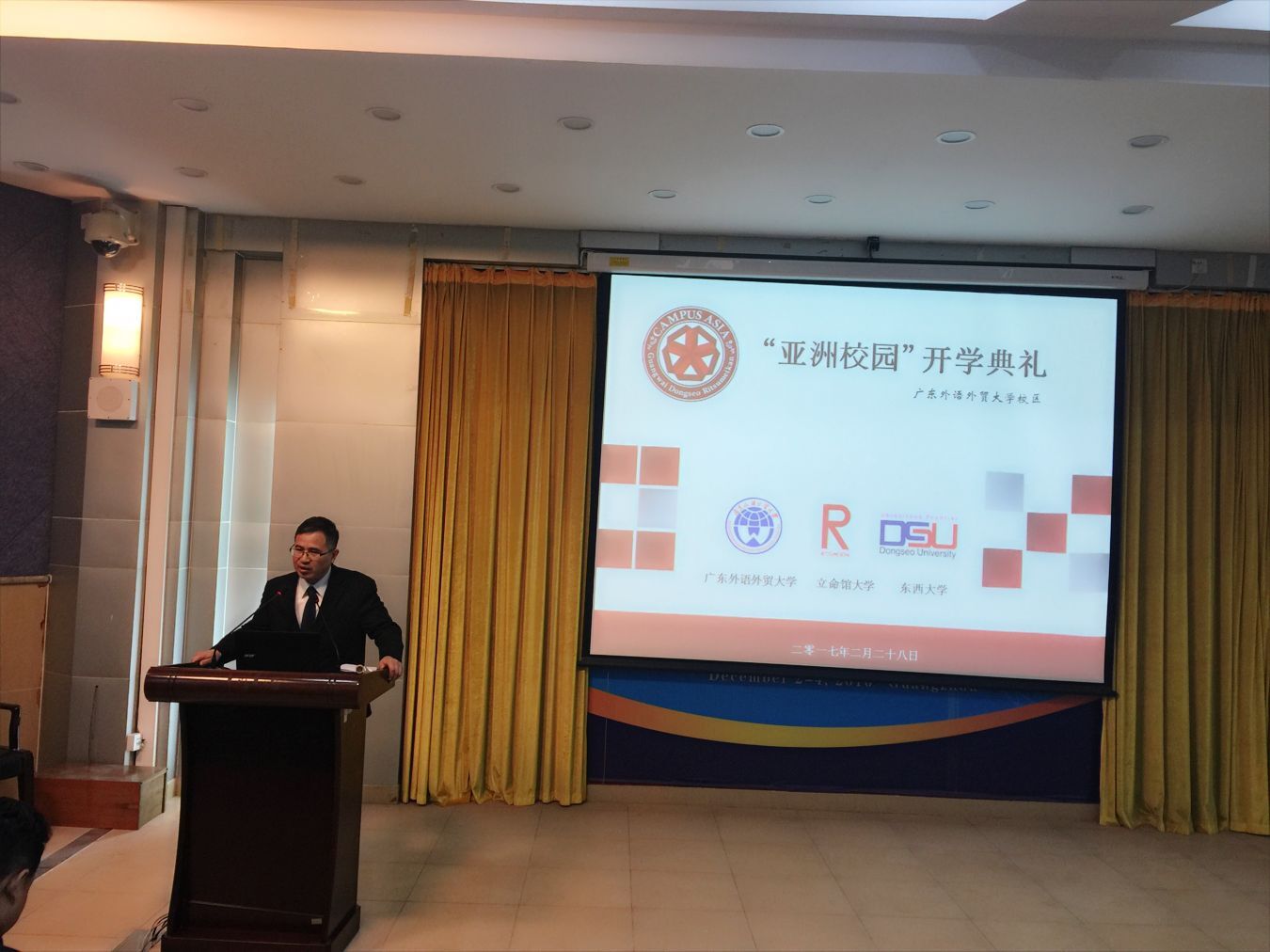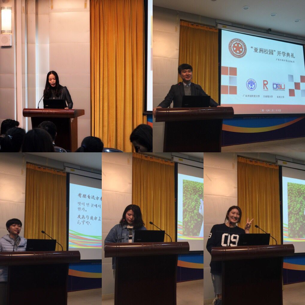 本网讯 2017年2月28日上午,中日韩“亚洲校园”广东外语外贸大学校区开学典礼在第7教学楼水上报告厅隆重举行。东语学院院长陈多友教授、副院长张秀强教授、亚洲校园教育中心代主任杨晓辉教授主持,中心的工作人员、教师出席了开学典礼。日本立命馆大学、韩国东西大学、及我校的同学共同见证了这一重要时刻。