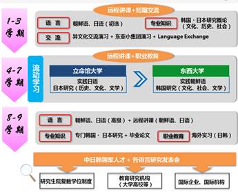 本项目划分为“1.5 +2 + 1”三阶段,实行中日韩三方大学联合培养模式。第一阶段(1-3学期)在国内开展专业日语与韩国语的语言学习;第二阶段的“流动校园”(4-7学期)期间留学日韩两国,日韩两国大学将设置专业语言课程、人文学、社会学等授课科目,学生在日韩两国开展体验式文化交流。第三阶段(8-9学期),为实现国际学习、国际就业的培养目标,三方大学将共同筹划国际就业所需的专业课程,并提供核心产业实习基地的就业培训机会,以此大幅提升学生在择业就业等方面的国际竞争力。
