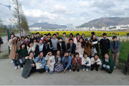 说起去年给每个同学留下深刻印象的恐怕就是李元范教授的课程了。今年也不例外,我们上的是李教授的韩国地域研究课,只是同我们中日学生一起上课的不仅限于中日韩亚洲校园的韩国学生,还有来自东西大学设计、广告等专业各年级的学生。我们围绕饮食文化、节日文化、居住文化、结婚文化以及家事分担文化等五个主题,依次进行了两轮发表。课前课后讨论,课上发表及讨论,在这一过程中我们不仅对韩中日三国的地域文化有了更深的了解,还对发表的技巧和礼仪有了更好的掌握。课上认真严肃的李教授,作为我们的“终身导师”,在课下的交流和谈话会上,慈祥亲切地给予了我们很多有关人生的指导与启迪。四月,李教授带领我们来到洛东江边,间隔一年再赏油菜花。田野里油菜花如同去年一样盛放,触景生情,便有同学感慨“年年岁岁花相似,岁岁年年人不同”。一年后的今天,变的不是我们的赤子之心,而是留学生活赋予我们的更加成熟的心智和更加开放的胸怀。
