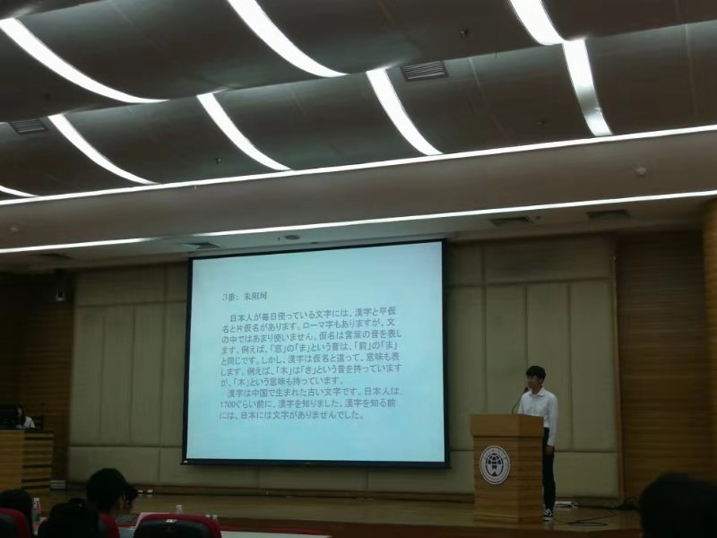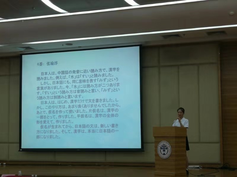伴随着主持人的报幕,日语朗读比赛作为第一个环节拉开了序幕。亚洲校园18级学生朱阳珂和张瑜淳作为日语朗读比赛的代表按照次序走上舞台朗读准备好的日语文章,并且接受评委老师的针对性提问。两位同学发音清晰、语调标准,回答问题时从容不迫,兼之仪态大方、谦和有礼;他们以出色的表现赢得了评委老师的肯定。
