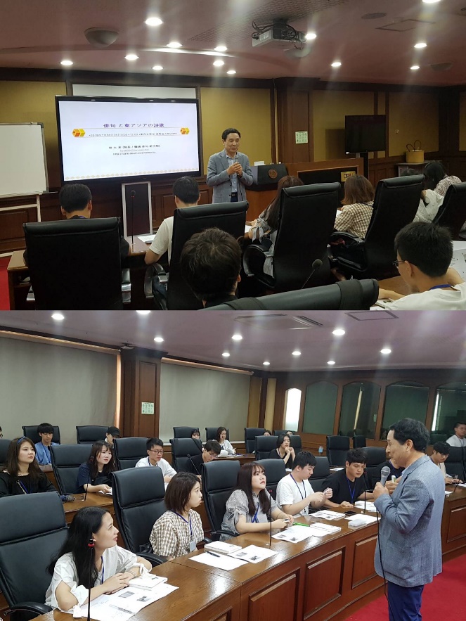 集中讲义期间,东西大学邀请了韩国俳句研究院的郭大贵教授,为学生们举行了主题讲座《俳句と東アジアの詩歌(俳句与东亚诗歌)》。讲座中郭教授对比了中国的古诗、日本的俳句与韩国的乡歌,分析了东亚传统诗歌的异同点,并与学生们展开了热烈的讨论。讲座气氛轻松活跃。