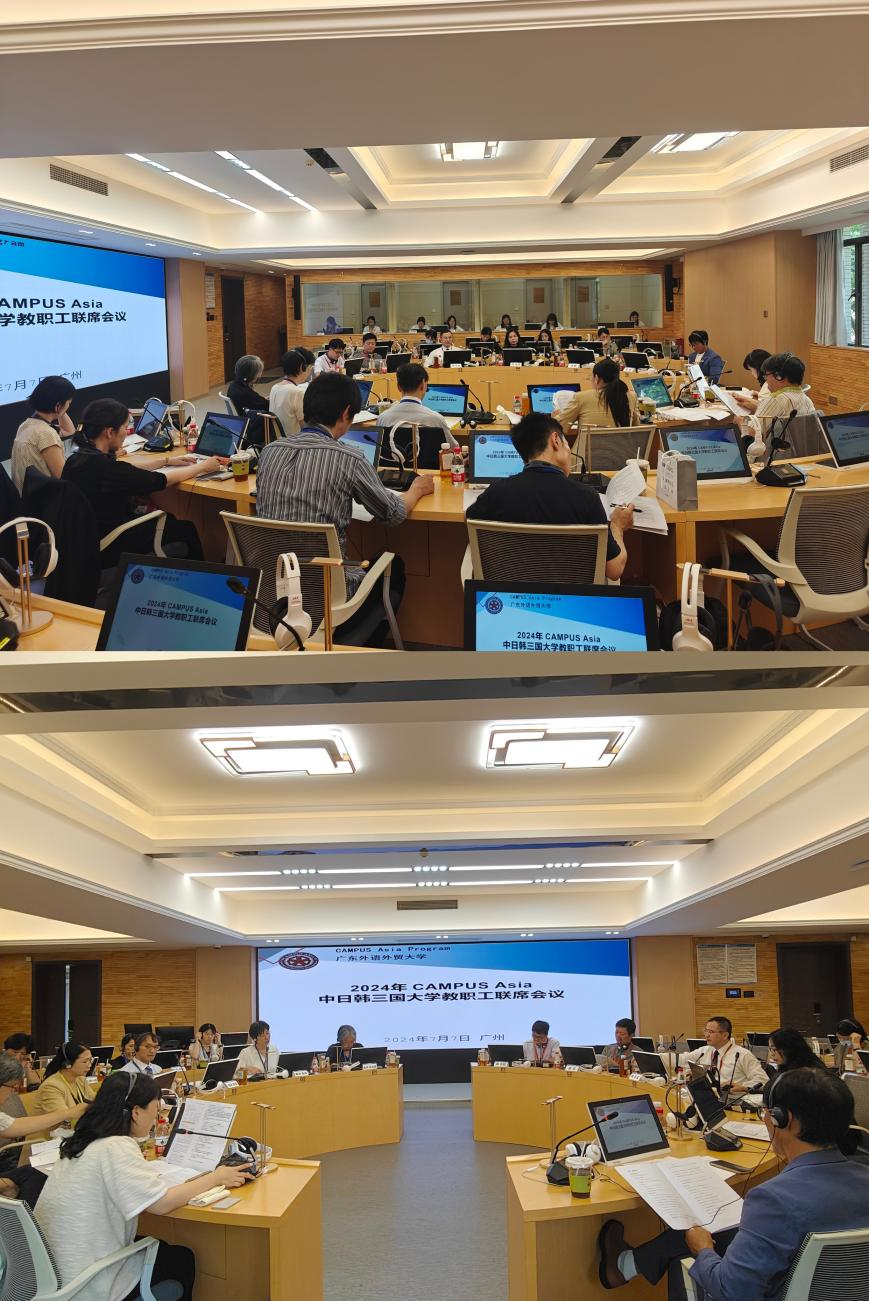 近日,2024年亚洲校园中日韩三国大学教职工联席会议在我校白云山校区六教A301同声传译会场召开。我校国际交流合作部部长周鹏、日语语言文化学院名誉院长与中方“亚洲校园”计划创始人陈多友、日语语言文化学院院长杨晓辉、副院长程亮,以及中日韩三方大学(广东外语外贸大学、日本立命馆大学、韩国东西大学)的相关教职员工共同出席了本次会议。会议由我校亚洲校园教育中心主任邓宇阳主持。