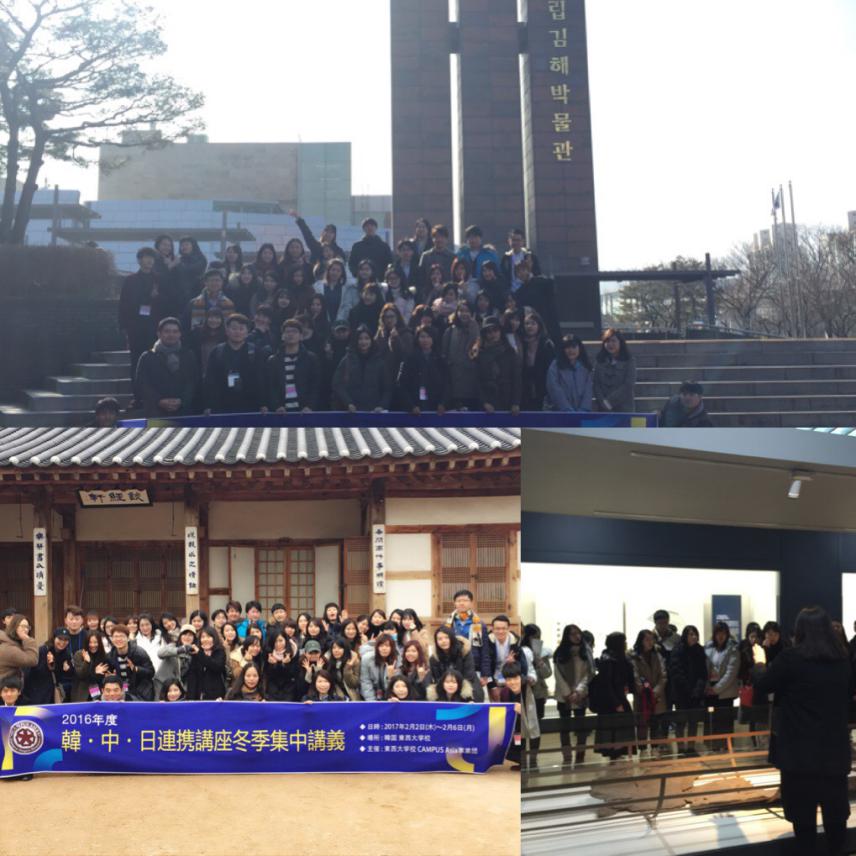 课堂授课之余,在诸点淑教授为代表的东西大学的安排下,三国师生还参观了该校的教育设施、金海国立博物馆、古代韩国的伽倻王国的历史遗迹,以及釜山的风景胜地——海云台、甘川文化村等,通过实地考察和参观,学生们对中日韩历史、文化的异同有了更为深刻的了解。