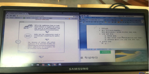 第三天和第四天与前两天所做的事情差异并不大,类似于在台湾的好几家出版社们联合将自己已出版的书编辑成一本册子向国外推出,然后从中选出一些书籍是你认为具有在韩国出版的理由,并将其内容梗概,出版理由写明。不过册子内容只有中英的书名以及查询地址。所以这些书需要自己一本本的上网查询仔细的内容这点是比较消耗时间的。组长还让我在联合出集的官网上关于外网申请出版翻译等内容的程序翻译出来。由于官网也是面向国外所以通篇都是英文,并且翻译时遇到有些涉及到出版的专业词汇的时候就感受到整体工作的难度比起前两天有所提升。