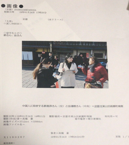 第四天与第五天我们的中心内容则是去日本的著名 “观光地”——花见小路处采访中国游客,大致访问他们对于景点以及京都的看法以及当地对于游客的一些礼仪上的要求,试图从游客与本地人的角度来写新闻记事。一开始被通知会放开手让我们真实地去采访虽然还是会有点担心以及对自己能否做好而忐忑,但实际去尝试后发现了大部分受访者很友好,在德永记者和高桥记者前辈的帮助下采访过程也比想象中的顺利与开心。当我们最后去采访以为在花见小路开广东料理的日本本地人时,却被告知说其实这里并不是观光地,也有相当一部分的本地人根本不想要观光客来此处。当时我们四个都非常震惊,而后经过交谈后也发现了站在了对方的角度也不是没有道理。从最后一次的采访中我们发现了作为记者,通过与不同的受访者交谈过程中,可以了解到不同立场的人的不同思考,从多方面的角度来知晓这个世界,并且客观地将其制作成新闻使世人知晓是一件非常有趣的事情。