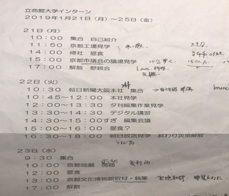 以下是我们到达第一天收到的实习前三天的的行程,这个行程敲定之前总局的局长和一位记者有来立命馆与我们一起商定,大体与讨论时候的内容接近同时也在那基础之上有所丰富。也使得我们在前三天的实习生活节奏非常的紧凑。