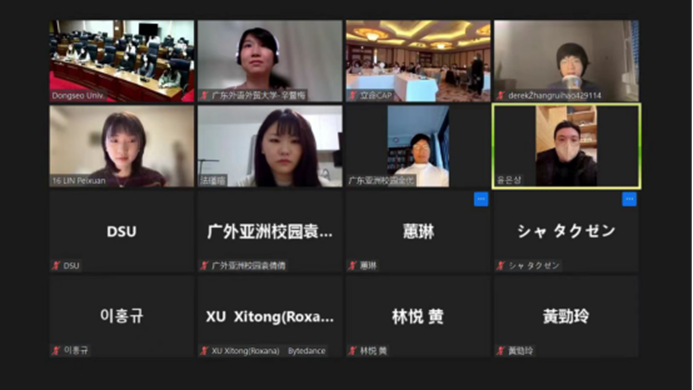 11月6日下午,中日韩三国亚洲校园毕业生通过ZOOM在线上相聚。广外亚洲校园教育中心辛暨梅主任、全优教授、行政秘书袁倩倩在线参与。