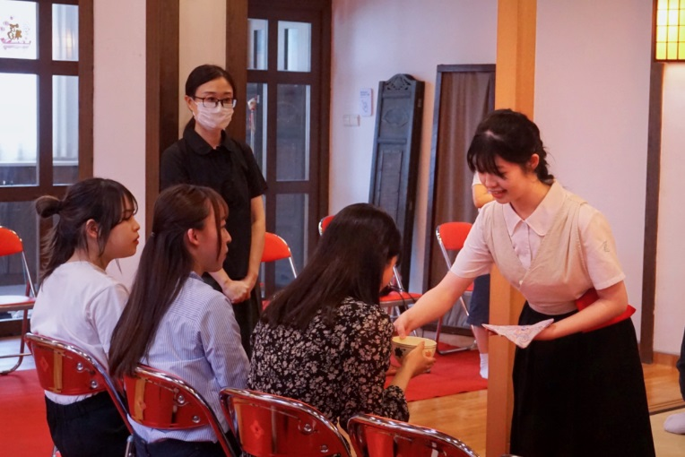 接着,杜凡老师就日本茶道用具的名称、历史由来、用途以及沏茶流程等主题娓娓道来。在“和敬清寂”的氛围下,伴随着杜凡老师的解说,“佳乐庵”茶室的学生助理为大家演示了一套完整的日本茶道的沏茶过程。沏茶表演结束后,亚洲校园的师生们品尝了现场泡沏的日本抹茶以及日本特色点心。